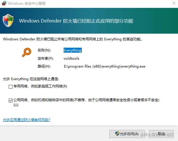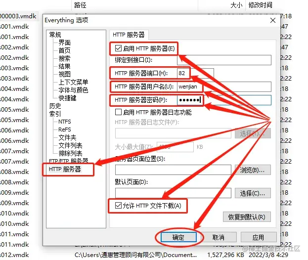接着我们对Everything进行几项设置,让其能通过网络访问到,方便我们在公共互联网访问。首先在软件主界面找到“工具”选项卡,进入“选项”页面,找到最下方的“HTTP服务器”。在这里,我们主要对5个栏位进行设置。首先是勾选“启用http服务器”;接着将“http服务器端口”栏设置为82(这个端口只要选择没有被占用的端口即可);其后的“http服务器用户名”和“http服务器密码”会显示在访问者登录界面,因此可以根据自己的需求进行设置;最后,勾选最下方的“允许http文件下载”,在这些设置完成后,就可以点击“确认”按钮,保存这些设置。此时有可能会出现Windows的安全警告,我们只需选择“允许访问互联网”即可。