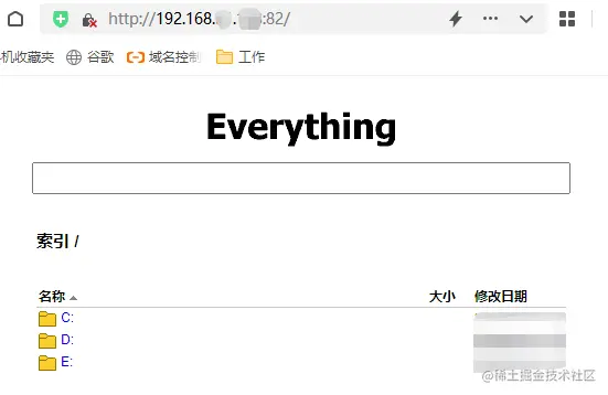 完成以上设置后,我们可以使用该电脑的IP地址+端口号作为网页地址(具体格式为电脑的内网地址:之前设置的端口号,如192.168.XXX.XXX:82),尝试从网络访问Everything。