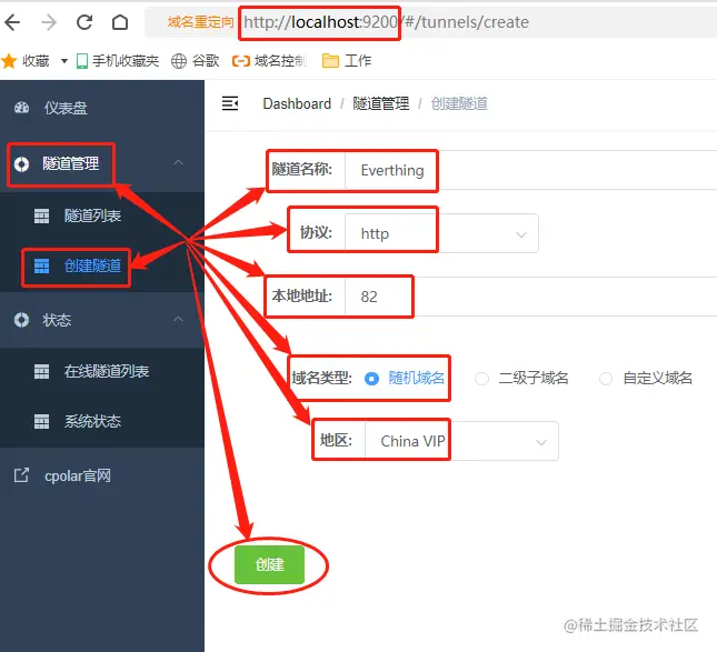 在cpolar的主界面,我们点击左侧“隧道管理”项下的“创建隧道”,对打算创建的能够连接Everything的隧道进行设置。首先是隧道名称,由于这条隧道专属Everything软件的,因此我们将隧道命名为“Everything”;接着是“协议”栏,我们选择“http”协议;接下来的“本地地址”就是指Everything的输出端口,我们之前将端口设定为82号端口,因此此处填入“82”;其后的“域名类型”勾选“随机域名”;地区则依照实际情况选择。在这些信息填写完毕后,就可以点击下方的“创建”按钮,生成数据隧道。