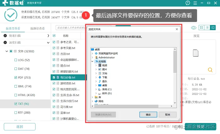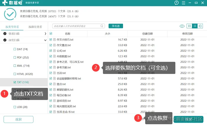 备注:如果没有找到或者找齐txt文档,就根据页面上方的相应提示—深度扫描,在更深层次的扫描里搜索更多,再选择文件,对文档进行恢复。
