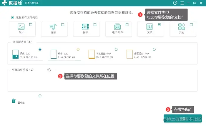 (1)扫描步骤:使用软件扫描电脑,软件会扫描出你需要恢复的txt文件。在开始扫描前,请先选择要恢复的文件类型。再选择文件之前所在的位置,开始扫描。