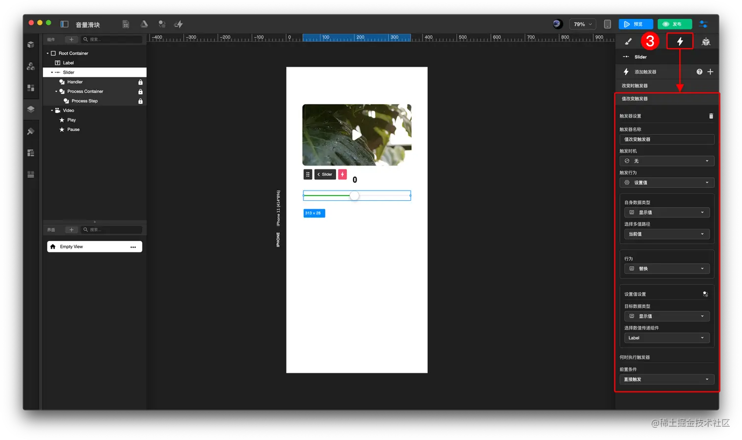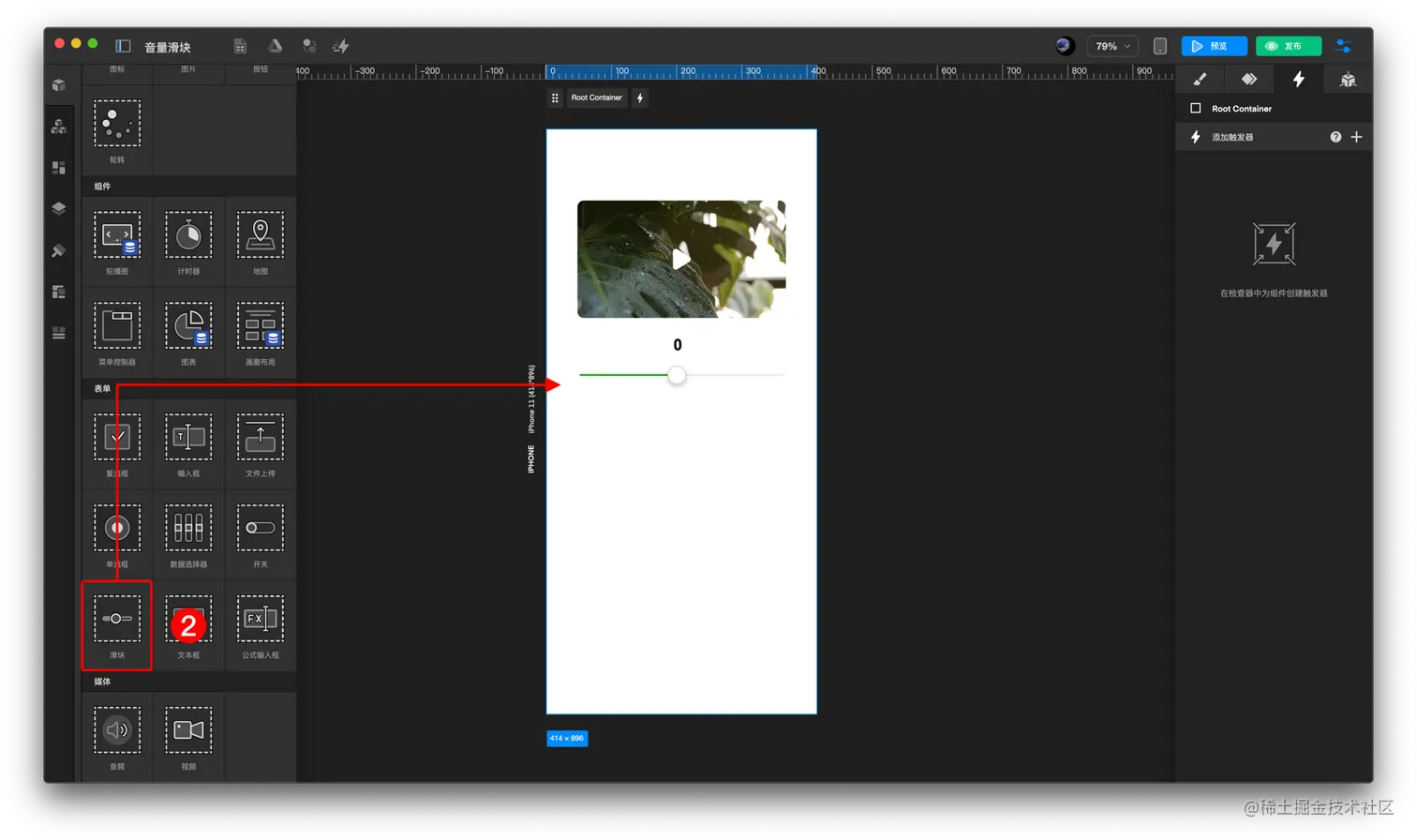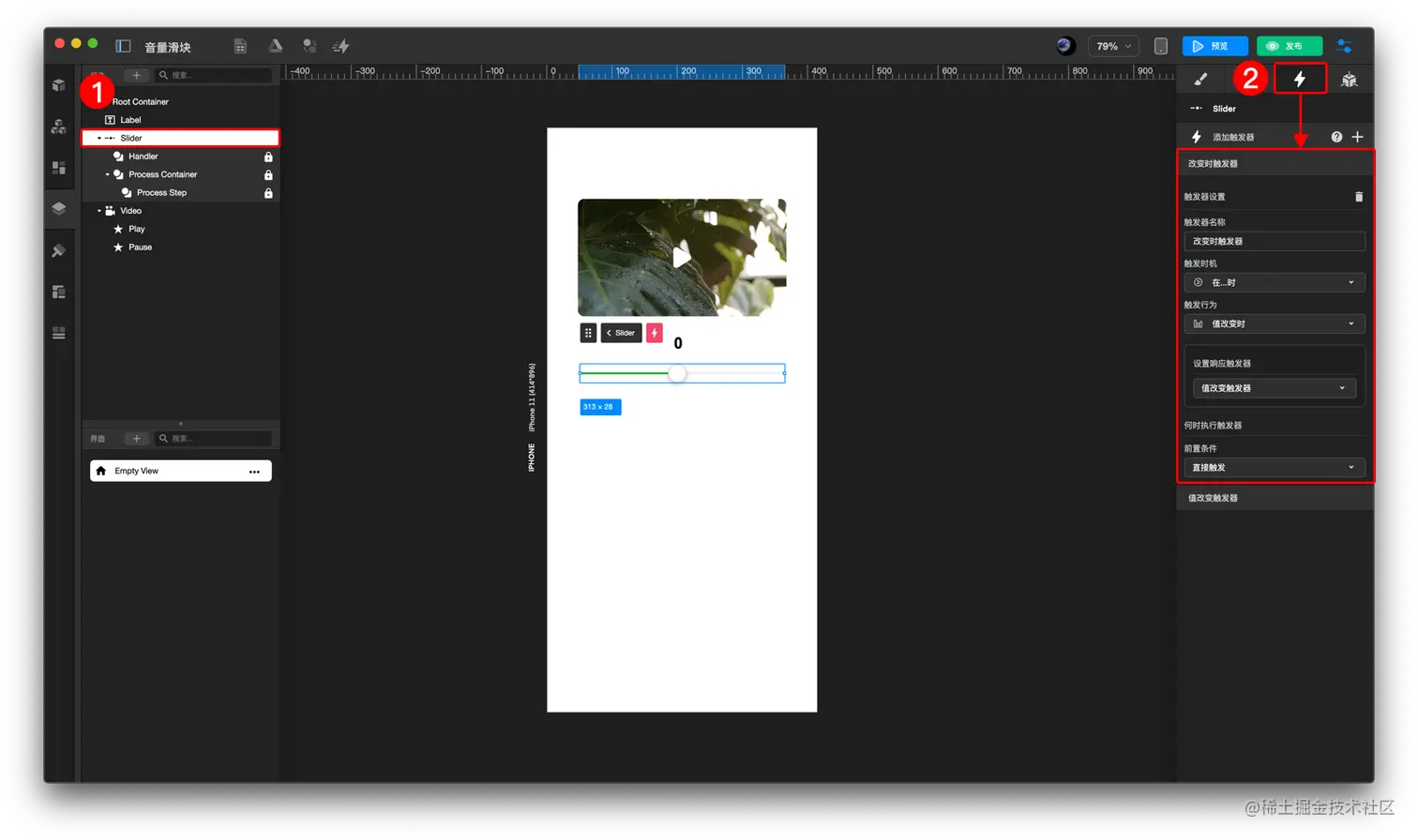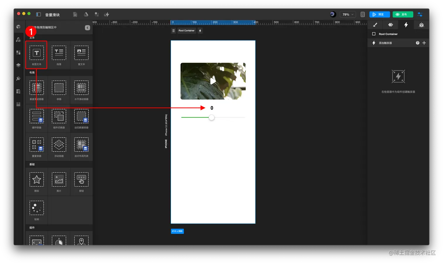 如何在播放器中使用滑块调整音量 TOWIFY 2022-11-10 126 阅读1分钟 效果展示: # **前置准备:** 搭建视频组件的页面 具体步骤: 添加标签文本和滑块组件 配置滑块组件 配置标签文本组件 步骤分解: 添加标签文本和滑块组件 添加 标签文本 组件 添加 滑块 组件 配置滑块组件 选中 滑块 组件 添加 改变时触发器 并配置相关数据 添加 值改变触发器 并配置相关数据 在 数据绑定及设置 中 配置 滑块-自定义数据
