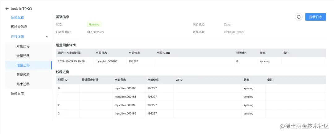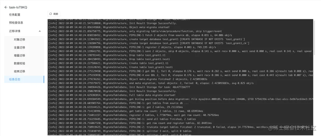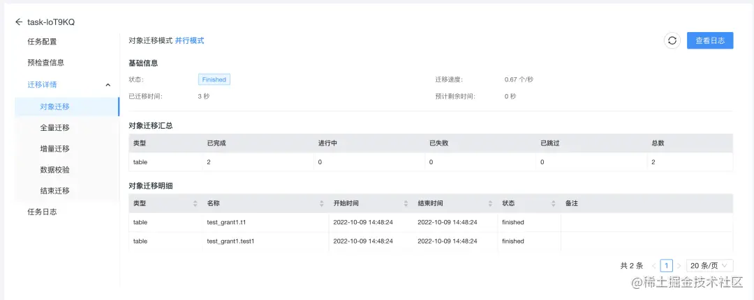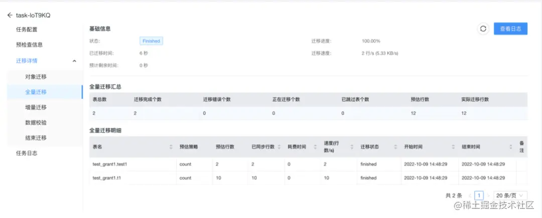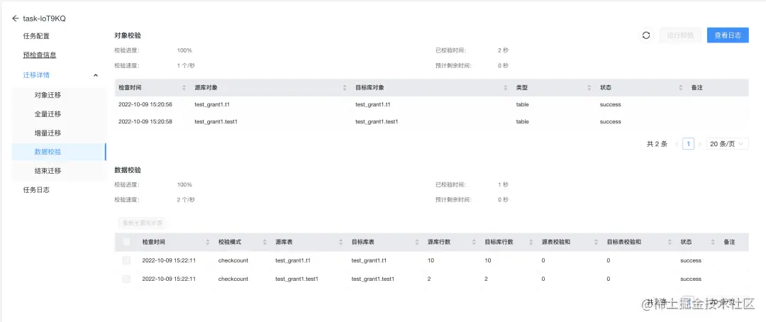 总体来看,这个操作是比较简单的。只需要配置好源端、目标端和迁移对象,它就会帮你创建好迁移任务。任务展示页面也比较清晰明了,同步了哪些内容,数据是否一致都有比较好的展现。