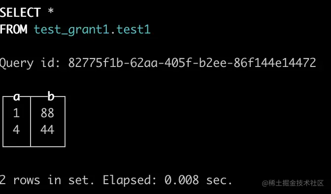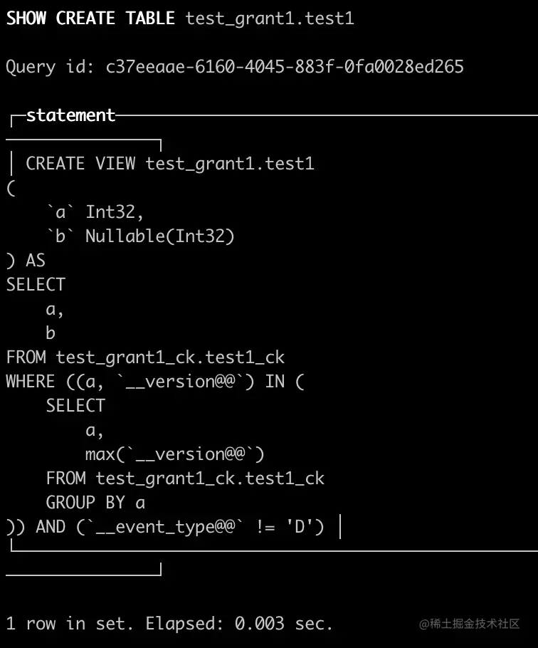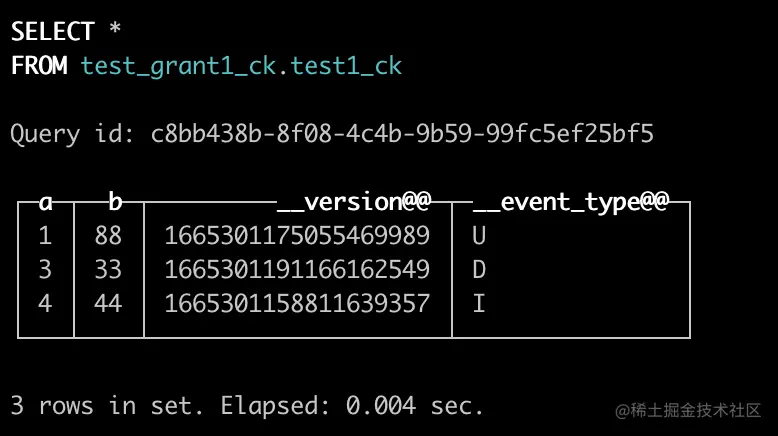 这里可以明显看到,test_grant1_ck.test1_ck中记录的是源库做的所有DML操作,通过视图合并后,test_grant1.test1查询出来的数据跟源库一模一样。