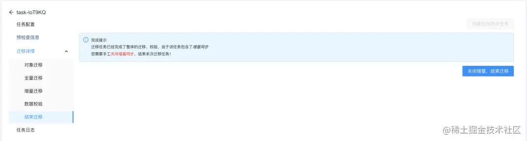 结束迁移是为了关闭增量,保证迁移完成以后,就可以结束迁移了。