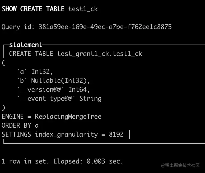 - test_grant1_ck.test1_ck是ReplacingMergeTree的表,除了a、b两列以外,还有__version@@和__event_type@@,对应version和sign两个字段。