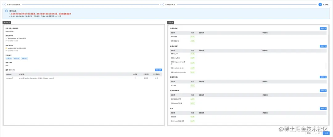 这个确认页面内容丰富,涵盖了源库、目标库和要迁移的对象的信息。还会主动预检查所有可能导致迁移失败的点,出现问题时会发出提醒,并给出修复建议,是一个比较方便的功能。