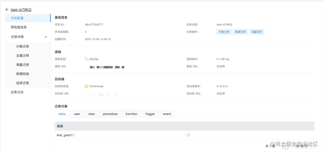 - 在任务配置页面,可以看到这次迁移同步任务的源库、目标库和迁移对象信息,之前的预检查信息也可以在这里回顾。