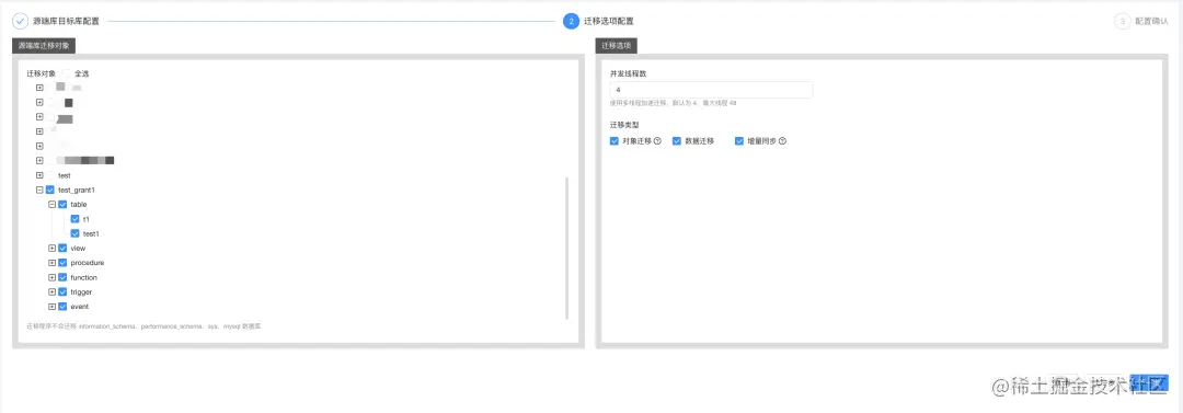 这里可以展开选择你要同步的表,选择并发数和迁移哪些MySQL的表到目标端。