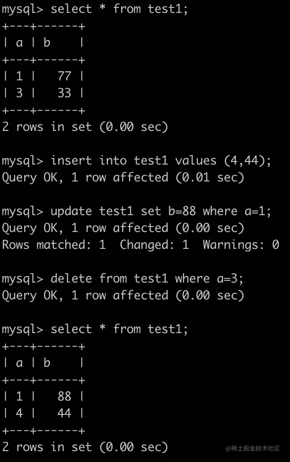mysql> insert into test1 values (1,11),(2,22),(3,33);mysql> update test1 set b=77 where a=1;mysql> delete from test1 where a=2;