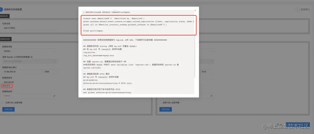 注意 :这里的源库与目标库的用户、权限,建议按照授权语句的要求,在源库和目标库新建用户,否则后面的预检查和迁移有可能会失败。迁移完成后,就可以将源端和目标端的用户删除。