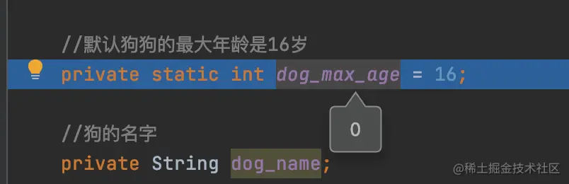 接着对已经分配存储空间的静态变量真正赋值,比如为上面的dog_max_age 赋值16,还有执行静态代码块,也就是类似下面的代码: