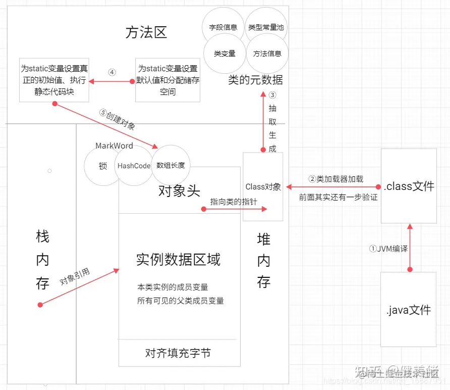 说了这么多估计很多人都没概念,懵逼状态中,其实很简单,我们只要记住new的创建对象就两步:初始化和实例化,再给你们搞一张图:可以简单理解②③④为初始化⑤实例化(可恶,我这该死的责任感!)