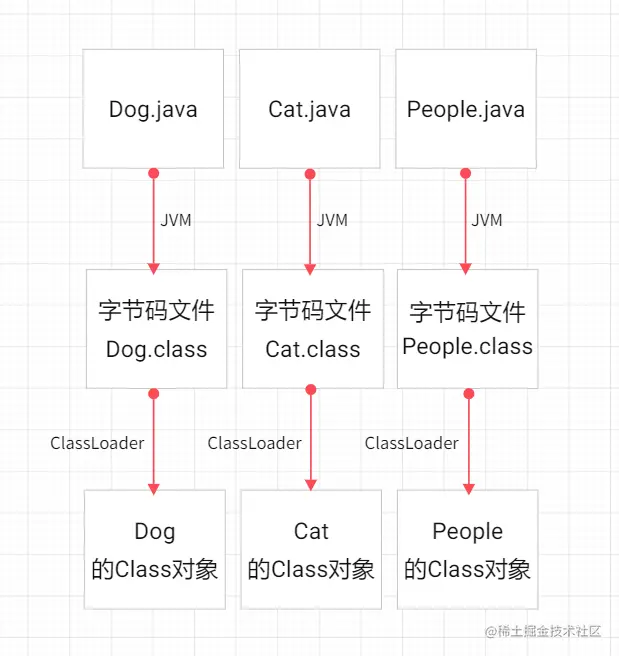 当然了,Class是个实实在在的类(用来描述类的类,比较拗口),有构造方法( private ,意味着可以生成对象,但不能手动生成,由JVM自动创建Class对象),类加载器会给每个java文件都创建一个Class对象,用来描述类,我画个图: