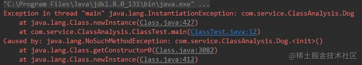 Class.newInstance() 只能够调用无参的构造函数,即默认的构造函数,我们在Class源码里也看到了其实最终还是调用了无参构造器对象 Constructor 的 newInstance 方法,举个栗子:Dog.class 中是没有无参构造方法,那么会直接抛出 InstantiationException 异常: