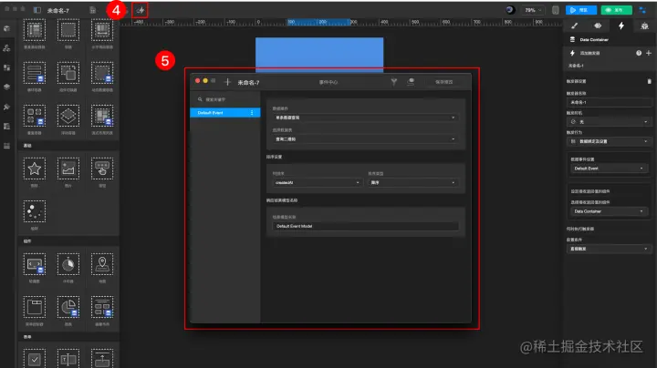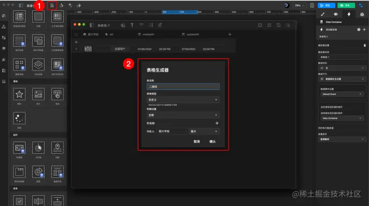 2.在数据中心创建数据表,在事件中心创建数据事件