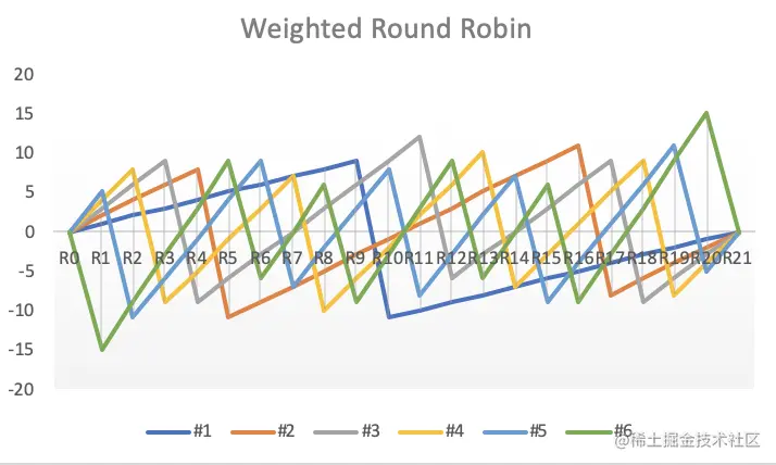 权重轮转算法中将会存储两个权重的值,一个是不会变化的原始权重,一个是会随着每次选择变化的当前权重。权重轮转实现中维护了一个循环不变量——所有节点的当前权重的和为0。每轮遍历过程中所有实例的有效权重都会增加它的原始权重,并选择出当前权重最高的节点。选择出权重最高的节点后将它的当前权重减去所有实例权重的总和,以避免它再次被选择。NGINX中加权轮询负载均衡算法使用此实现(NGINX)。这种算法的优势是它很平滑,低权重节点的等待时间较短,并且每轮权重轮转的最小正周期很小,是所有服务器实例权重的和。。