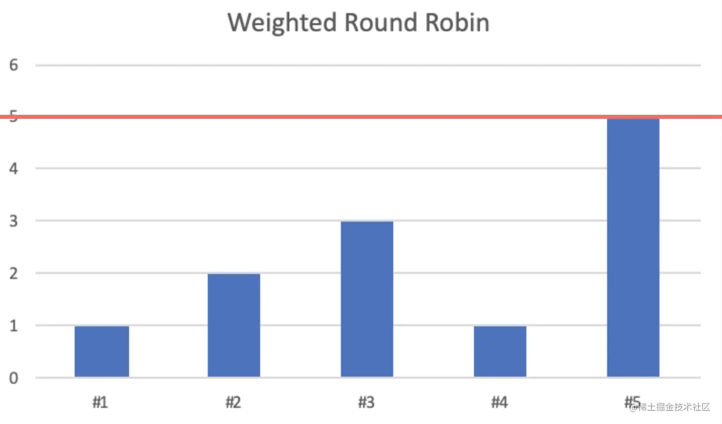 上界收敛选择方式提前计算出所有权重的最大值,并将初始上界设置为所有权重的最大值,接下来我们一轮一轮地去遍历所有实例,并找到权重大于等于上界的实例。当前轮遍历结束后,所有大于等于上界的元素都被选取到了,接下来开始尝试权重更低的节点,直到最后上界为0时,将其重新置为最大值。目前openresty (有人在issue #44上分析了这种算法)
