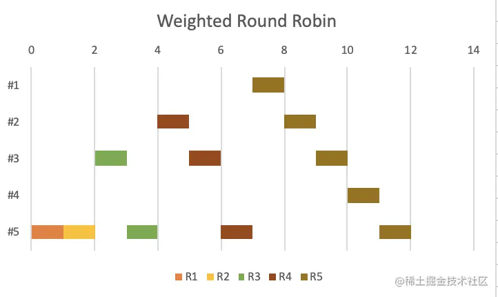 在NGINX中又叫做平滑加权负载均衡(Smooth Weighted Load Balancing,SWRR)。