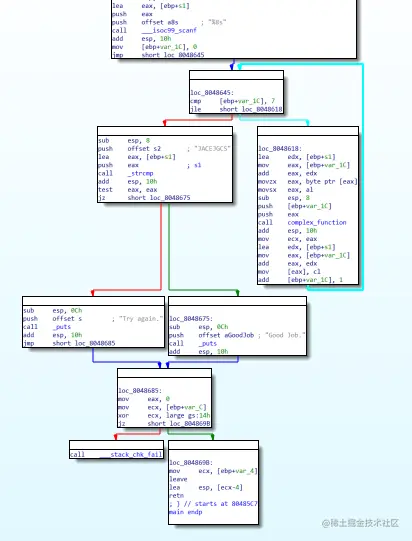 如下为题目的伪代码,这里如果按照逆向的思维我们需要逆向complex_function函数的算法。但是angr却不一样,它利用了unicorn-engine这个库(Python、C)进行跨平台模拟执行,在不断的模拟执行之中,它分析出了进入不同的块之间所需要的条件;