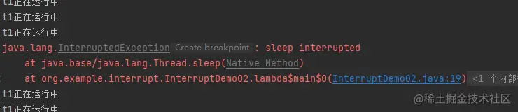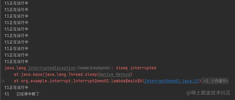 这相当于是t2对t1发起了中断请求,t1接受了中断请求,并且打印了t1 is interrupted。