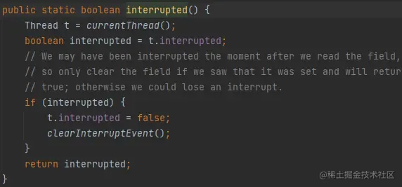 这是Thread类的静态方法。它的作用我们之前提过,是将中断标志位清空,并且返回当前的中断状态。