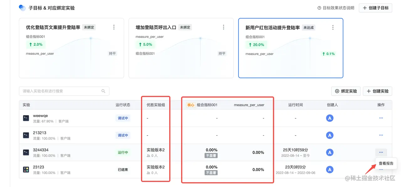 在 DataTester 的产品界面中,可以一目了然每一个子目标的关联实验,及其指标的详细信息。