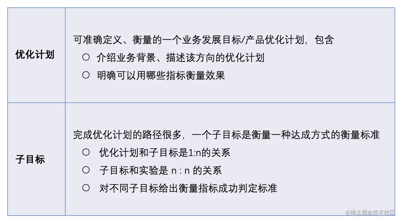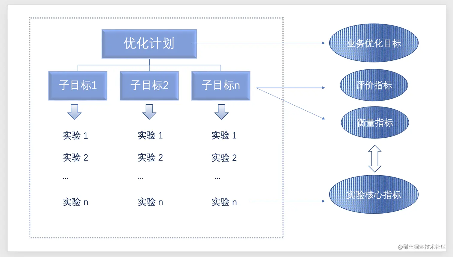 业务只需要设置总体的优化目标,并通过“评价指标”和“衡量标准”完成不同子目标的拆解,即可针对子目标分别设置实验,并统筹查看效果。