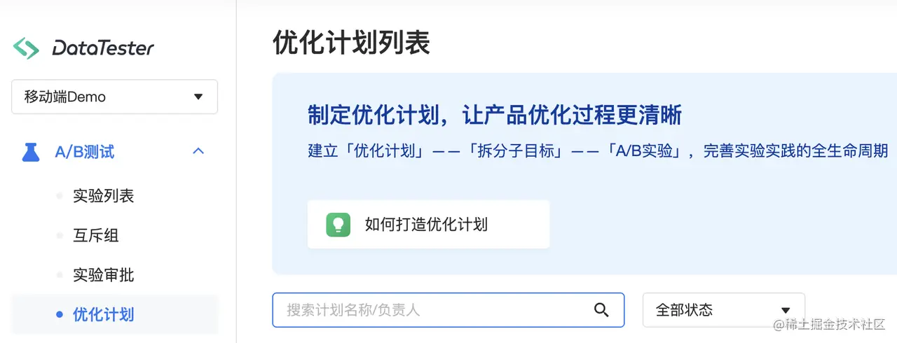 DataTester 的「优化计划」能力,可以直接帮助企业管理多重A/B实验的业务逻辑,并直观展示所有A/B实验的进度与动态。
