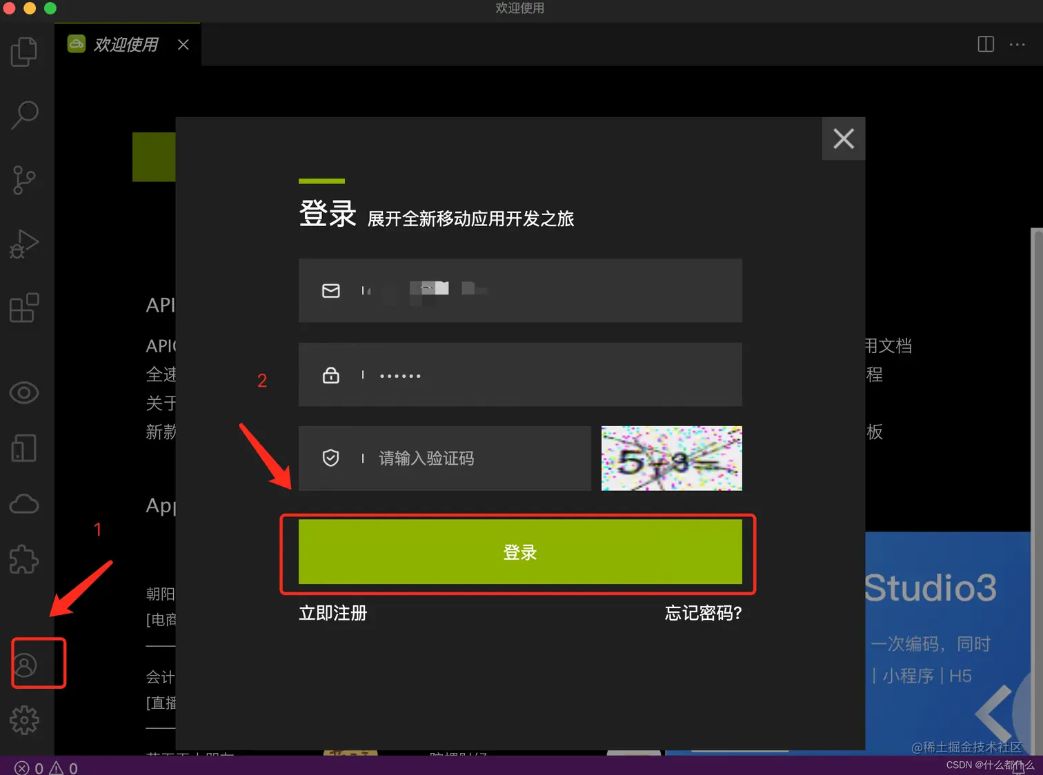 3.1.1 启动APICloud Studio3,并进行账户登录(没有账户的返回上一步骤先进行账户注册)