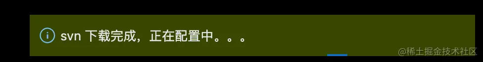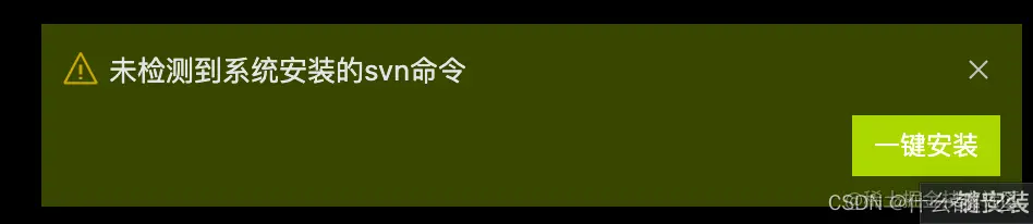PS【特殊情况】: 因为云端项目数据使用svn方式进行的仓库存储,所以需要本地安装有svn环境,开发工具才能完成代码的拉取,所以当本地没有svn环境时,工具的右下角会弹出如下图的提示信息,此时点击「一键安装」即可,开发工具会自动完成svn的安装
