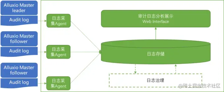 Alluxio的审计日志在整个系统中是数据源性质的存在。Alluxio 支持审计日志功能,Leader Master 通过 audit log 的方式记录用户的行为,从而满足审计、问题回溯分析、用户行为分析以及冷热数据分析等需求。虽然audit log只在Leader Master才真正有记录,但是因为Alluxio Master存在切换的可能,所以,任何一个Master都有可能会生成audit log,都需要收集、分析。