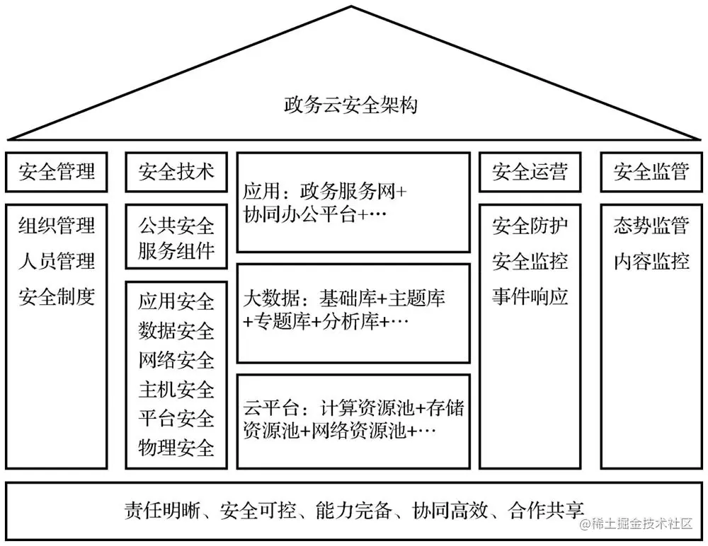 政务云安全体系建设需以全局、整体的思路整合资源、优化流程,建立权责相符的安全责任机制,以及覆盖管理、技术、运营、监管四个维度的全方位政务云安全防护体系,为政务云、政务大数据和政务应用提供全面的安全保障。政务云安全架构如图1所示。