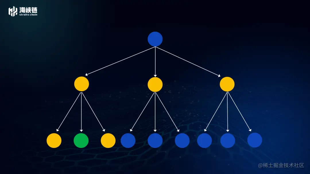有效性证明是一棵树,包括从文件根CID到待证明文件片CID的路径,及该路径上所有节点的兄弟节点,如下图中,希望生成绿色节点的有效性证明,则绿色、黄色节点的CID均需包括在该证明中,蓝色节点的CID无需包含在该证明中。