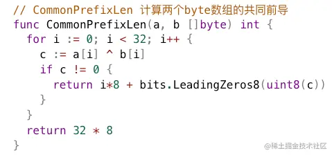 函数CommonPrefixLen(x,y)用于求两个相同位数的二进制数值的共同前导零个数,go语言实现如下: