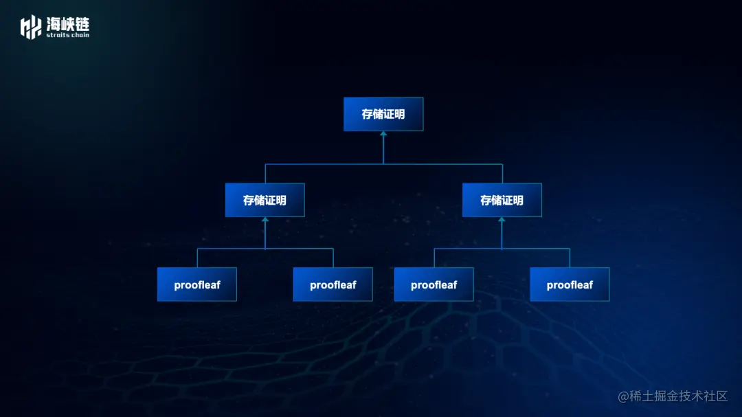 每个本地存储的文件片都会生成proofLeaf,所有proofLeaf组成merkle树即为存储证明树,树根即为存在性证明。下图为存储证明树的结构: