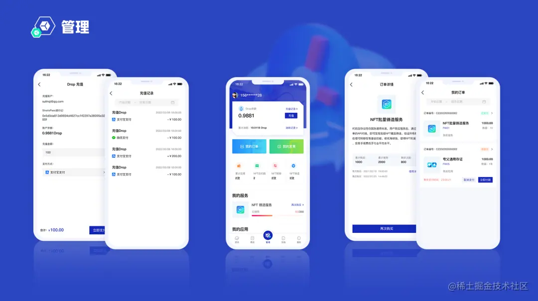 “管理”板块集成了Drop充值、订单管理、发票管理等功能,让海峡链的开发者无需登录浏览器也能够轻松管理链上服务。目前,Beta版已支持查看Drop余额、充值记录、消耗记录和开票记录,可快速浏览已购买的应用服务的历史订单、订单详情和使用详情,并且以曲线图的方式直观地展示了账户链上交易的历史数据和增长情况。后续版本将陆续上线Drop充值、应用购买、服务续费、发票管理等一系列实用的功能,敬请期待!