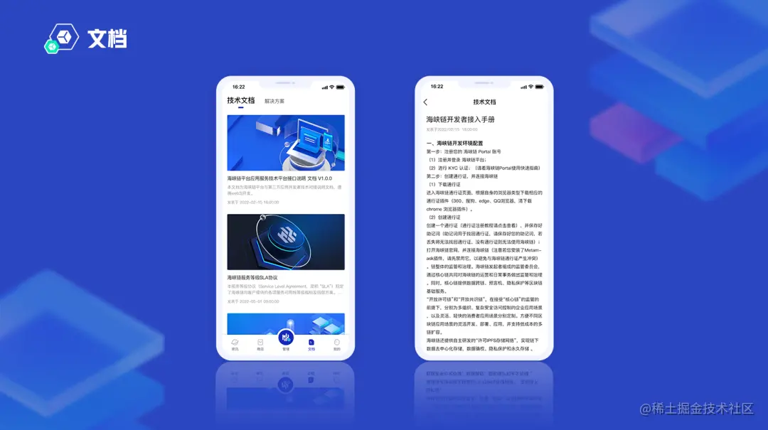 “文档”是方便开发者查阅海峡链的相关技术文档和服务协议文件等资料的专属板块。目前,已经发布了**《海峡链服务等级SLA协议》、《海峡链技术白皮书》、《海峡链开发者接入手册》、《海峡链平台应用服务技术平台接口说明文档V2.1.0》**等资料。开发者通过阅读“文档”板块的资料,能够快速了解海峡链的服务,熟悉海峡链的接口,以便快速接入海峡链。未来,“文档”板块还将持续更新开发者文档,发布海峡链最新的服务协议等资料。