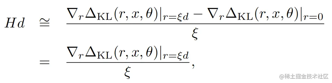 而以上Hd同样可以被近似计算,因为上面KL的一阶导数为0,所以我们可以用KL~rHr的一阶差分来估计Hd,于是也就得了d的近似值