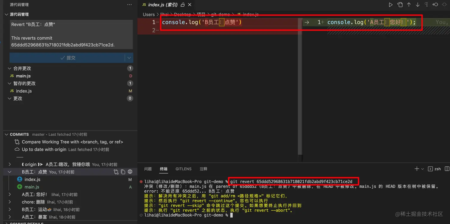 解决A员工的问题有两种方法:git reset、git revert,它们都能达到回退至某个历史git提交记录目的。