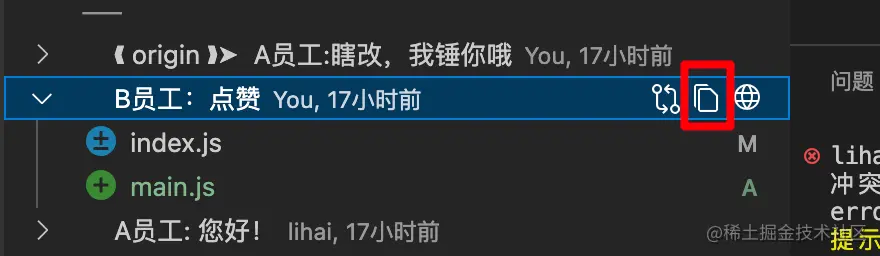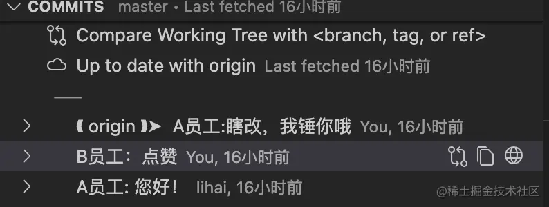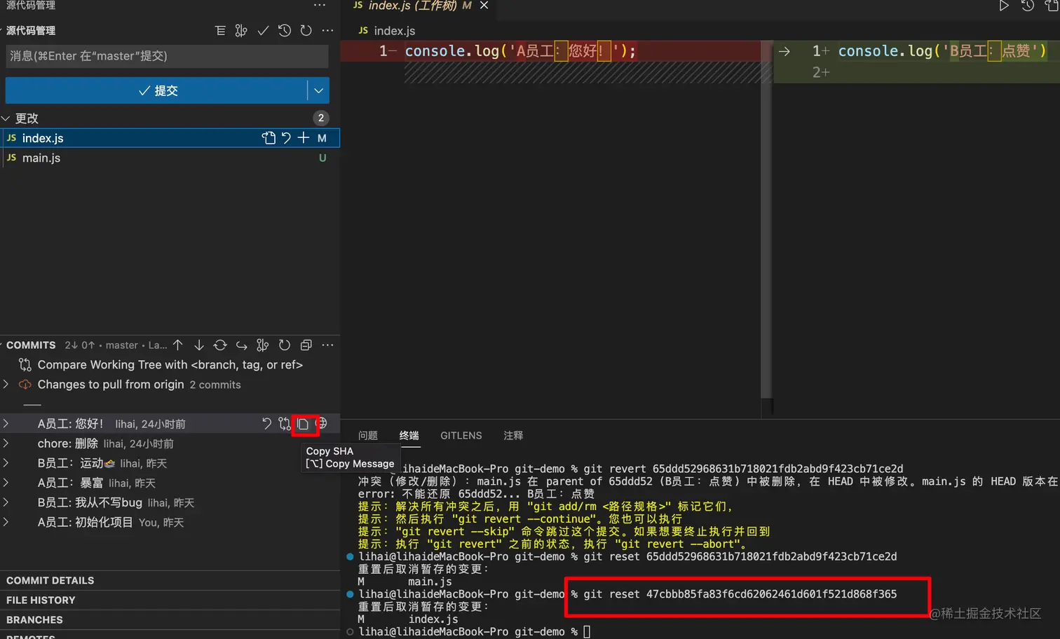 相同的,我们把git历史记录回退到A员工提交的"A员工:您好!",此时与git revert稍有不同;需要使用提交记录"A员工:你好!"的commit id。将git 历史记录"A员工:你好!"之后提交的所有记录回退。