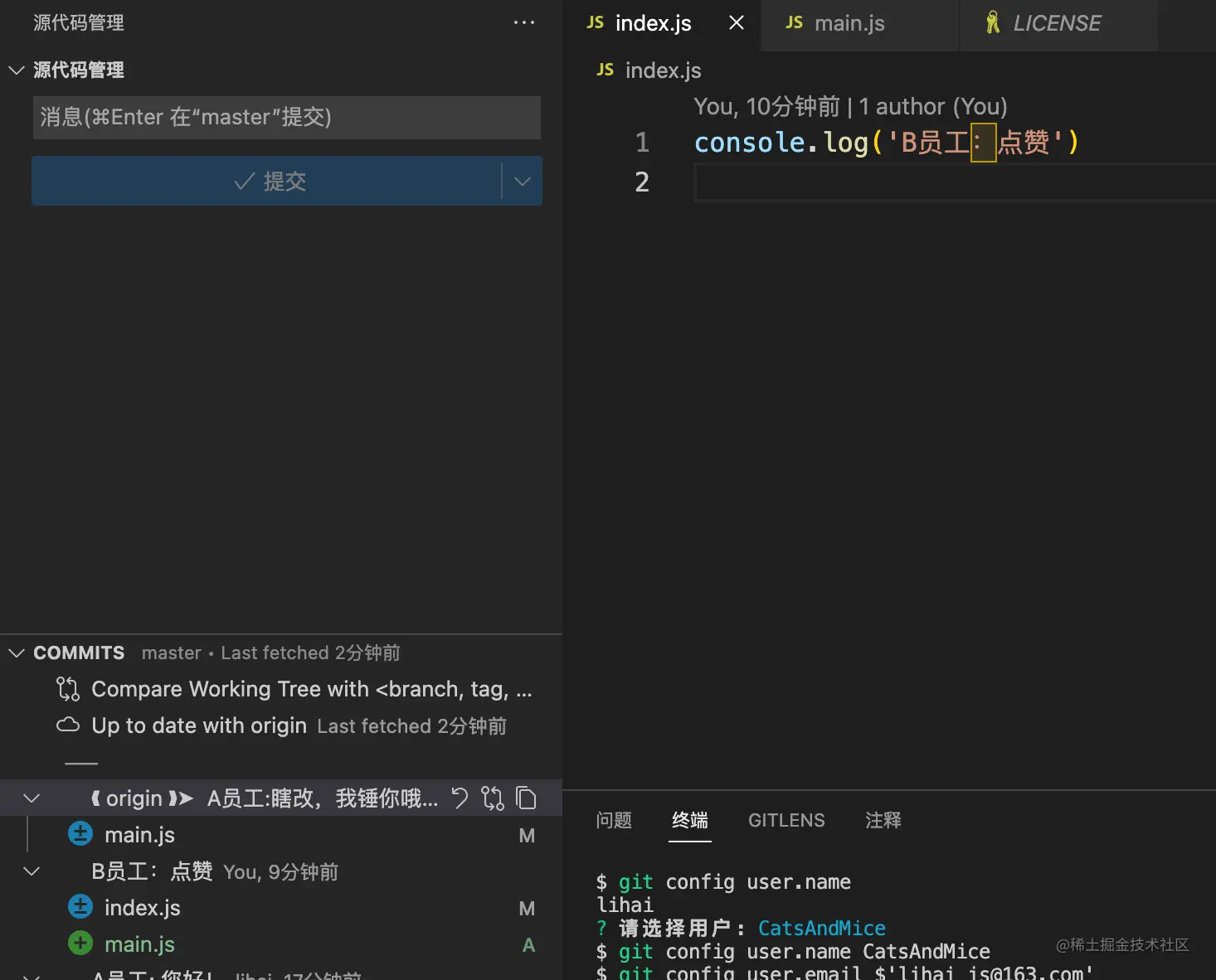 index.js文件中console.log('A员工:您好!');这一行代码,并且写入console.log('B员工:点赞') - 创建