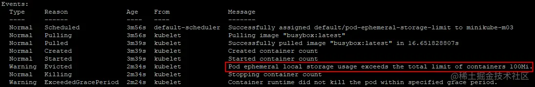可以看到 kubelet 发现Pod使用的本地临时存储空间超过了限制的100Mi,然后就把 Pod 关掉了。
