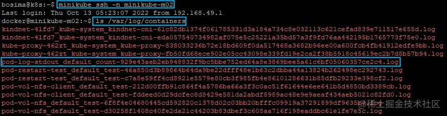 这些日志保存在节点本地的 /var/log/container 目录下,我们可以实际创建一个Pod来确认下: