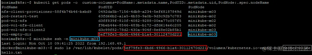 K8S会在当前的Node自动创建一个目录来实际承载这个卷,目录的位置在Node的 /var/lib/kubelet/pods 路径下。要查看这个目录中的内容,需要先找到Pod Id和对应的Node,然后登录到这个Node,就能找到这个目录了。minikube中的查找方法如下图所示: