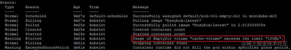 可以看到 kubelet 发现 emptyDir volume 超出了100Mi的限制,然后就把 Pod 关掉了。