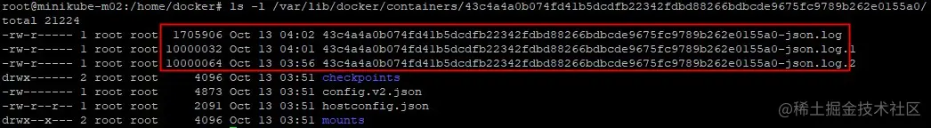 在docker运行时下,容器日志实际上位于 /var/lib/docker/containers 中,先找到容器Id,然后就可以观察到这些日志的变化了:
