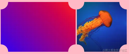 在这里,我们定义了一个没有尺寸的radial-gradient(),默认情况下它是100%的高度和100%宽度。这让我们在中间有一个洞。我们将渐变平移到图像宽度和高度的一半,将孔移动到一个角落。由于默认情况下,CSS mask重复,因此我们在每个角落都得到相同的效果。我们有四个切角,只使用了一个渐变!