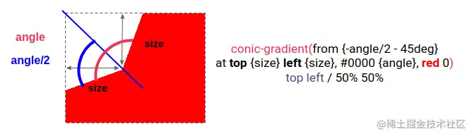 我们有两个参数:切割的大小和角度。为了获得形状,我们需要每个角落的conic-gradient()。这种配置与本文启动的示例非常相似。
