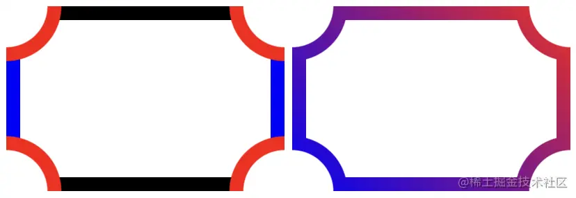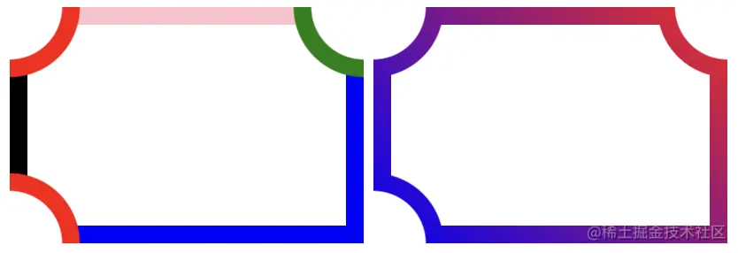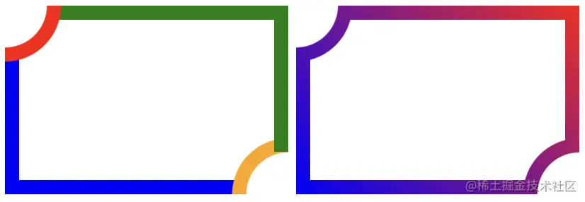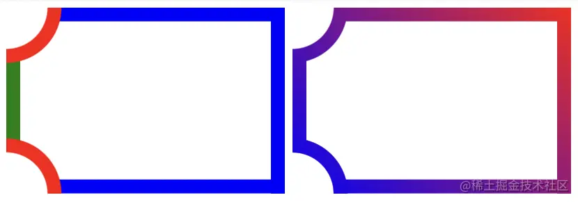 图一说明了径向渐变(红色)和锥形渐变(蓝色和绿色)。图二中,我们将它们全部应用到CSS mask属性中,以创建一个切割角的纯边框形状。